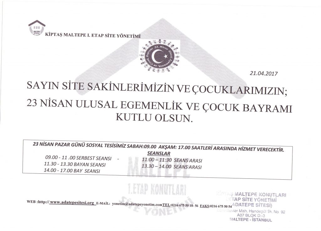 23 NİSAN ULUSAL EGEMENLİK VE ÇOCUK BAYRAMI Adatepe Sitesi Siteden Haberler, Yönetim Duyuruları 21/04/2017